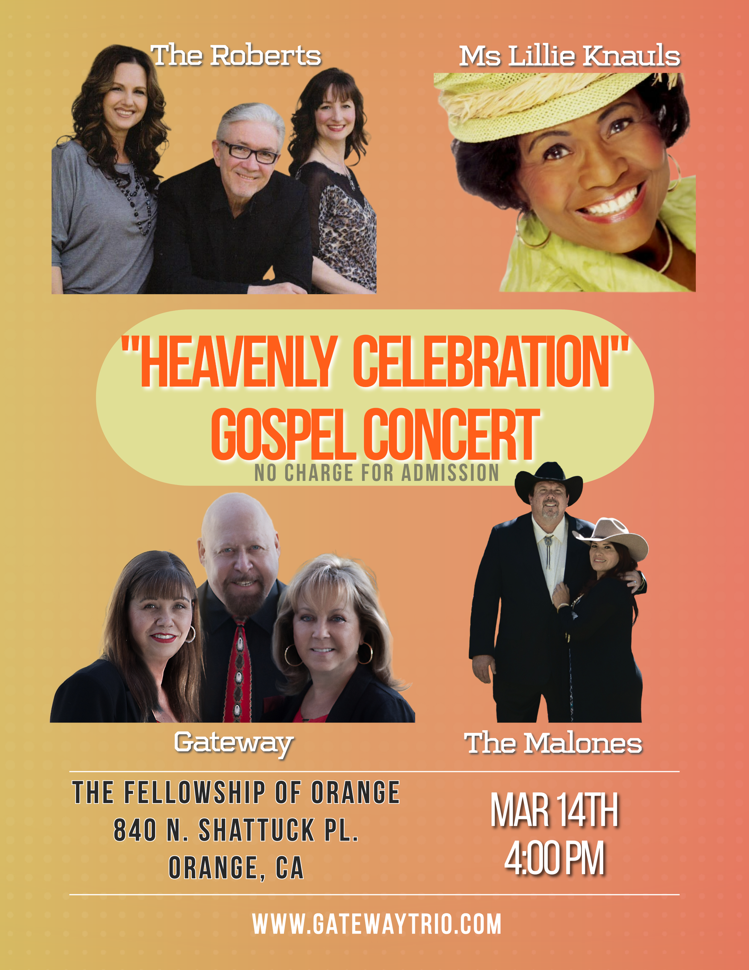 Join us for an exciting concert featuring the music of Gateway, The Roberts, The Malones, and Gaither Homecoming Artist, Ms. Lillie Knauls.