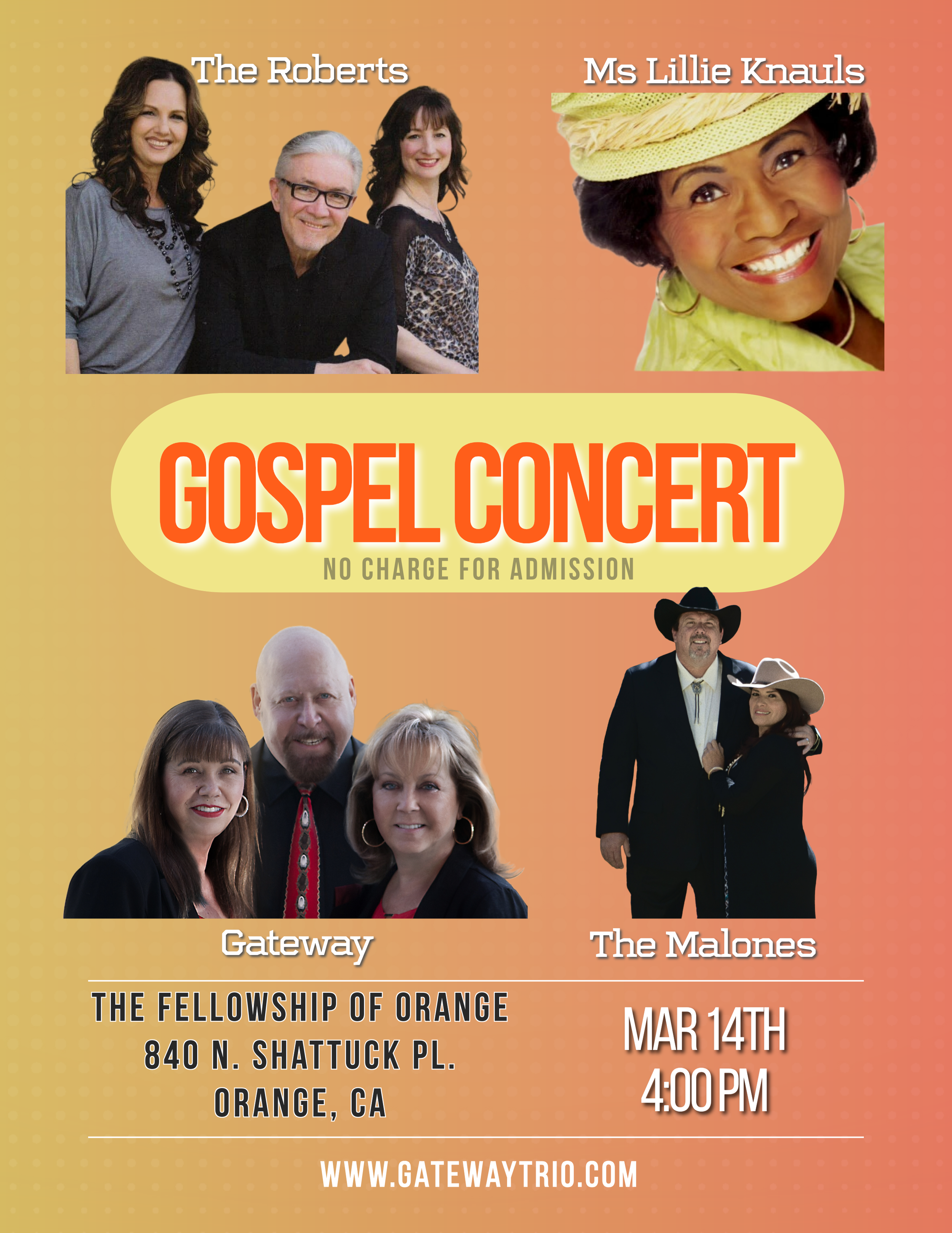 Join us for an exciting concert featuring the music of Gateway, The Roberts, The Malones, and Gaither Homecoming Artist, Ms. Lillie Knauls.